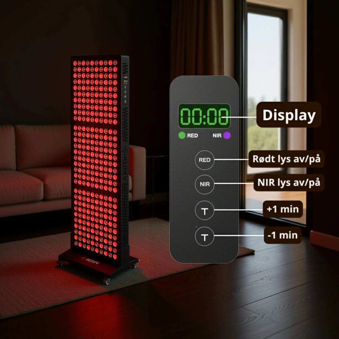Vi anbefaler en avstand på 15–30 cm fra panelet, med behandlinger på 10–20 minutter per område. Lengre økter gir ikke nødvendigvis bedre resultater, da cellene slutter å absorbere lys etter ca 20 minutter. Tilpass varigheten etter hvordan kroppen din reagerer.